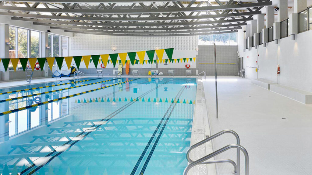The Havergal College Pool is a Class A, six-lane, 25-metre pool designed for both instructional and competitive use. Featuring floor-to-ceiling windows, the facility offers sweeping views of the Junior School Playscape, Lower Pitch, Tennis Courts, and the scenic Burke Brook Ravine. The pool ranges in depth from 3.5 ft. at the shallow end to 12 ft. at the deep end, and can accommodate up to 157 bathers at a time. A second-floor viewing gallery overlooks the pool and offers seating for up to 50 spectators, making it an ideal venue for swim meets, lessons and community programming.